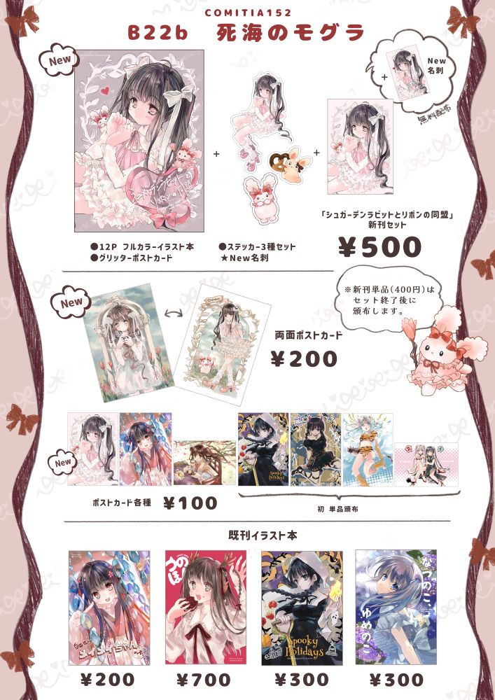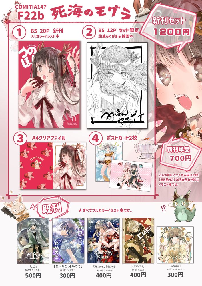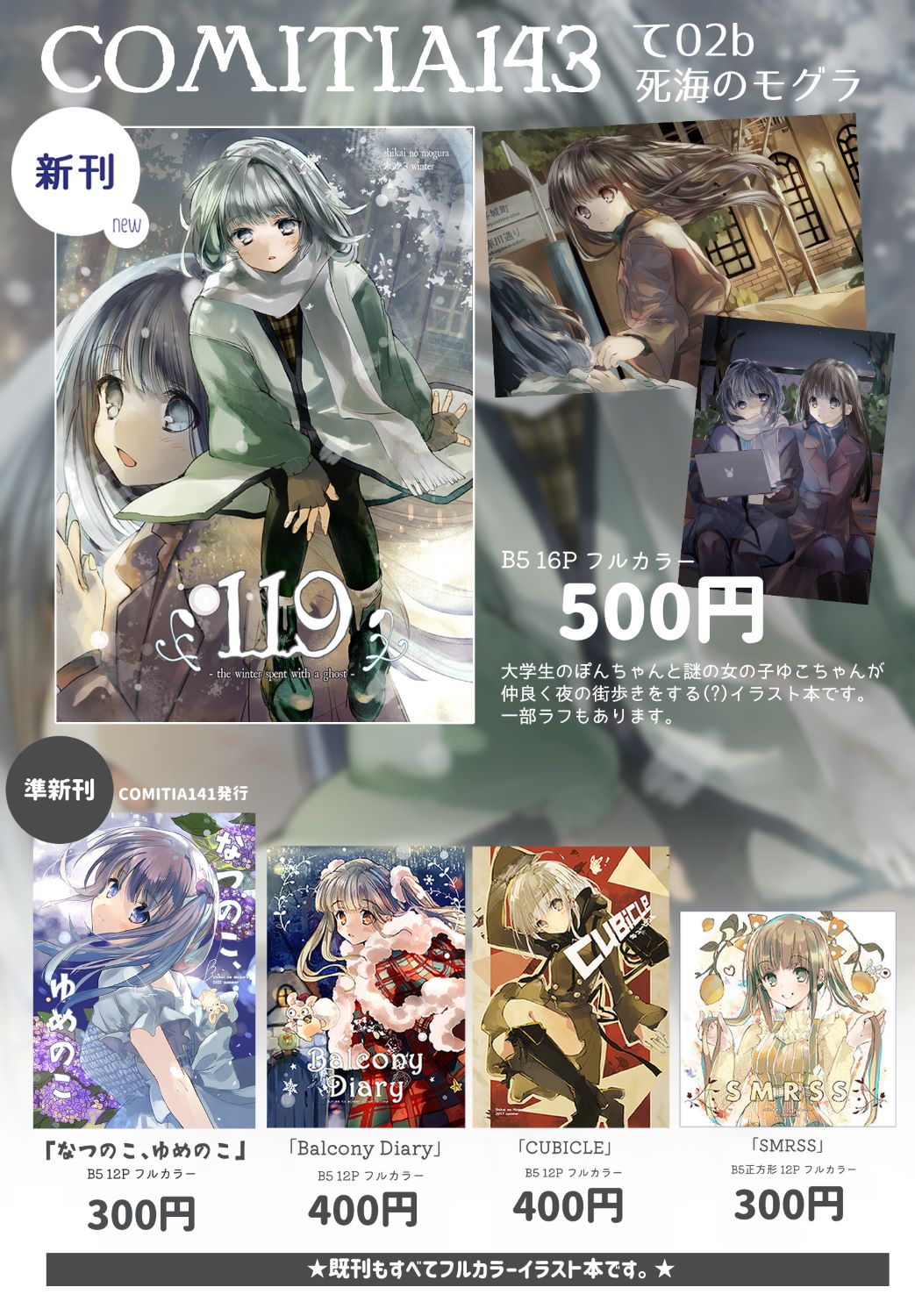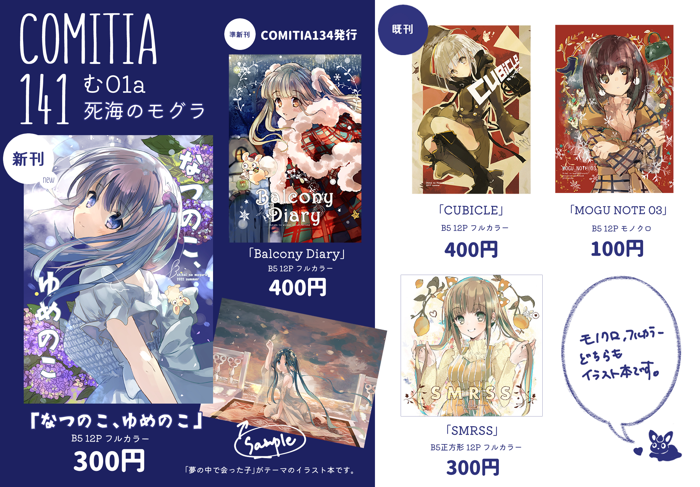 ●既刊は「119」「なつのこ、ゆめのこ」「Balcony Diary」「SMRSS」「CUBICLE」を持っていく予定です。(すべてオリジナルイラスト本です。)